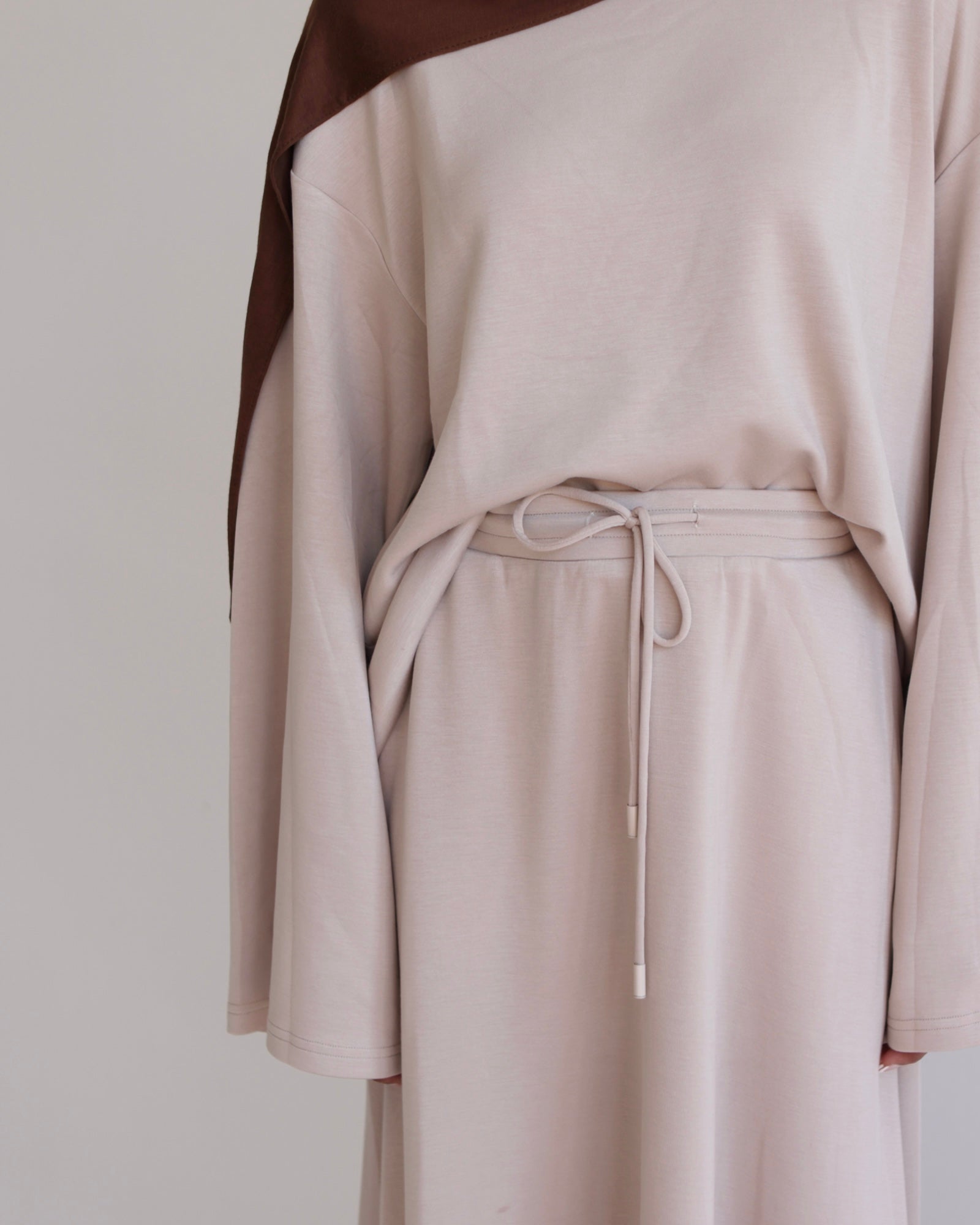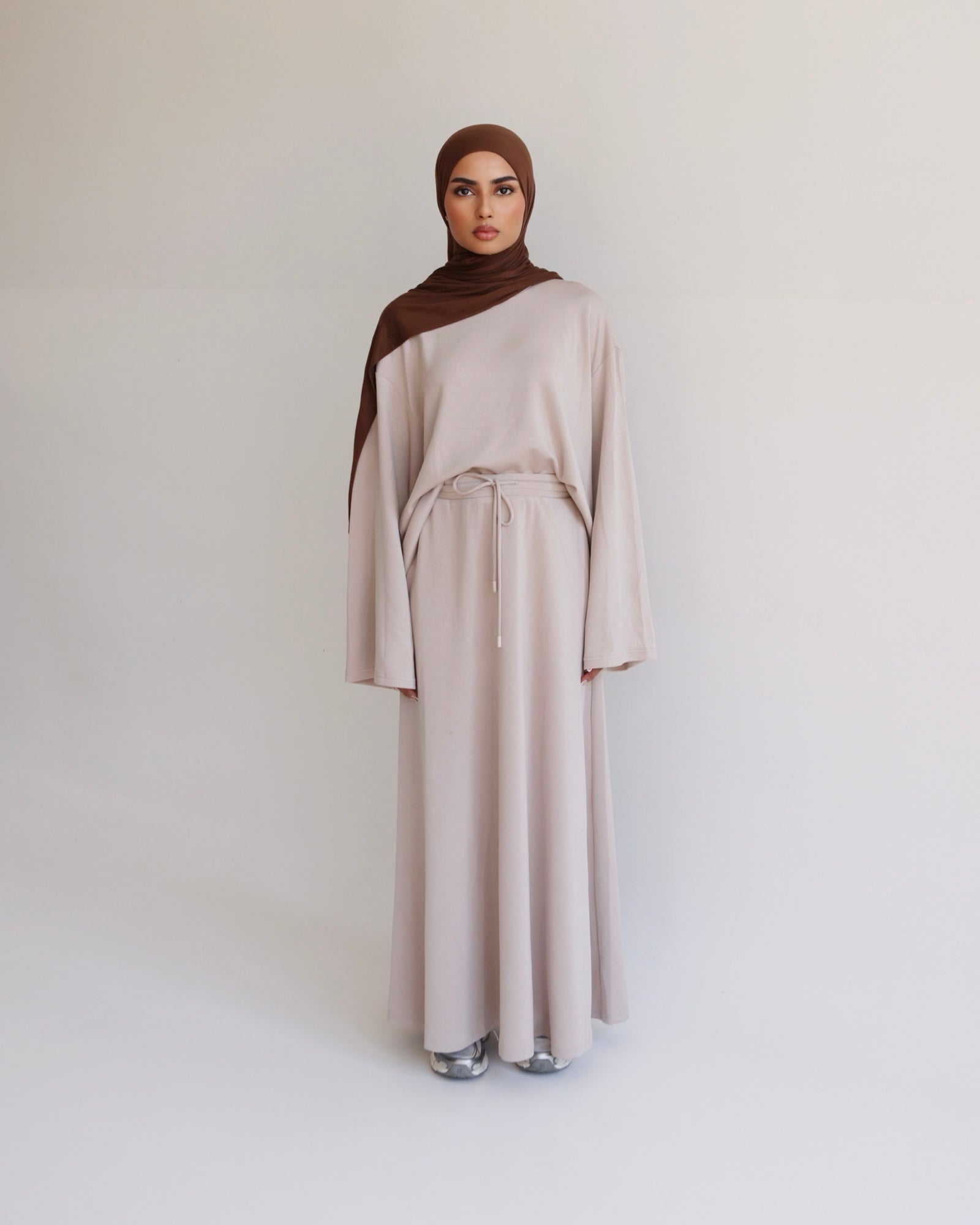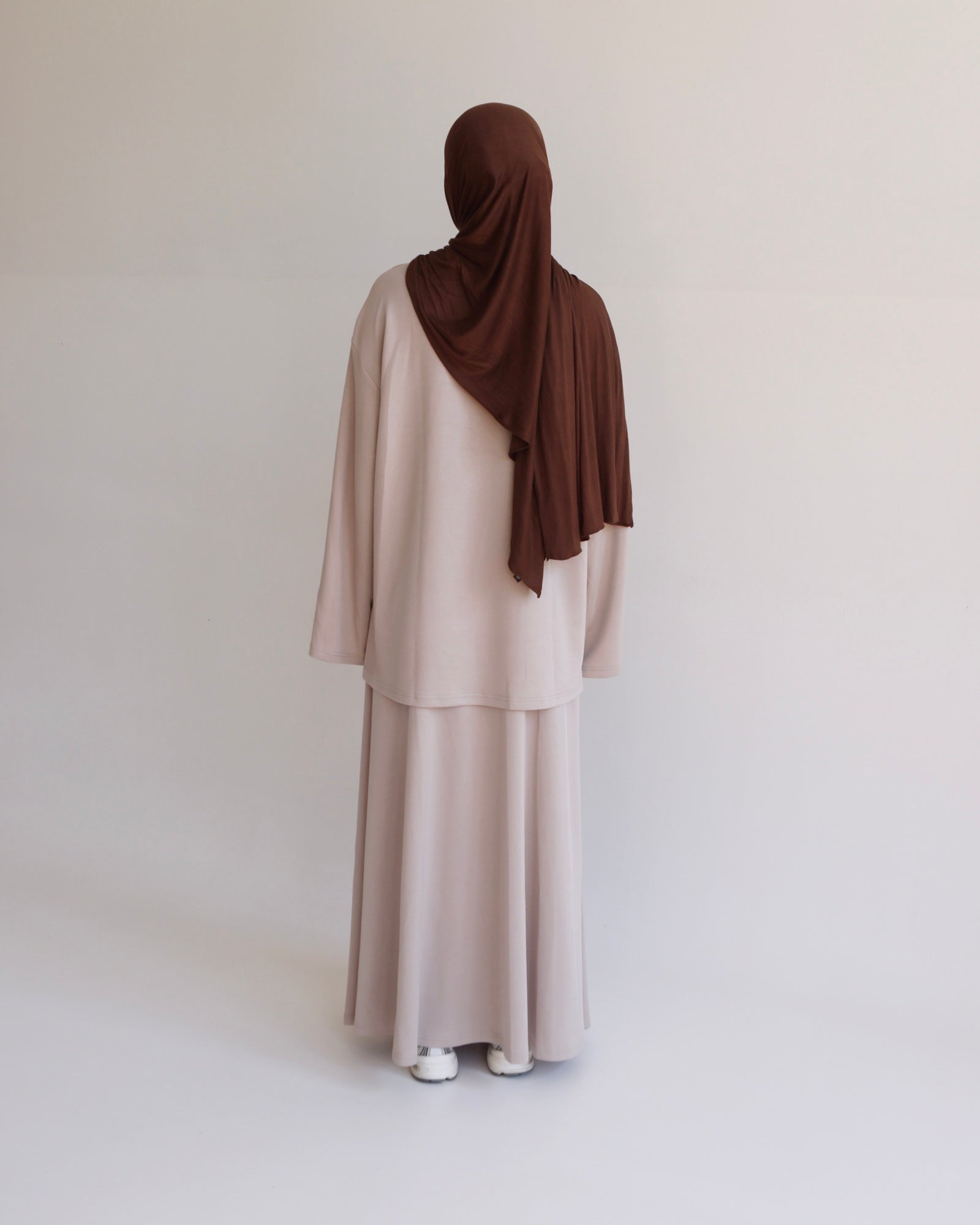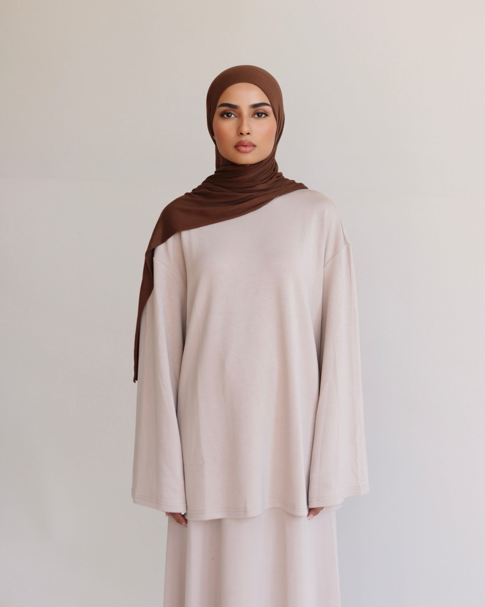 A beautifully relaxed two-piece set crafted from a soft, lightweight modal blend that is smooth, breathable, with a comfortably stretchy feel and is non see through. The top features an oversized silhouette with dropped shoulders and a clean crew neckline, offering effortless modesty and ease of movement. Paired with a flowy, full-length skirt that drapes gracefully, this set creates a simple yet elevated everyday look. Perfect for casual outings, home comfort, or styling with your favourite accessories for a chic, laid-back finish.